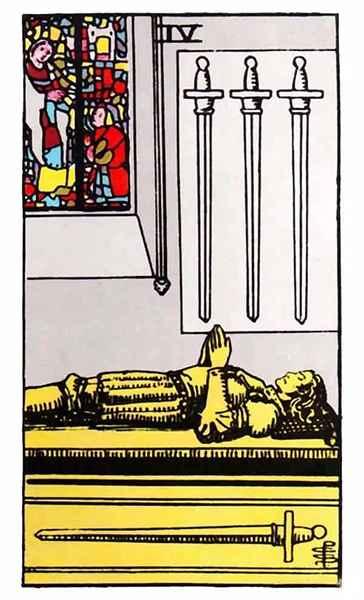 A man rests peacefully beneath three swords hanging on the wall, with a fourth sword lying beside him—he can rise to action at any moment. Compared to other cards in the Swords suit, this image exudes a sense of serenity and calm. It typically represents a state of inactivity, but this is not pure idleness. Instead, it is a period of rest to recharge one’s energy, pause ongoing tasks, and plan for the next steps. Once fully prepared, he will leap into action at a moment’s notice to continue his unfinished business. "Rest is for the sake of better work" encapsulates the card’s primary meaning.