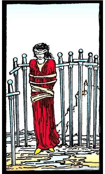 The woman in the image is blindfolded and has her hands tied, trapped within a circle of swords. She cannot stretch out her hands, cannot see, and cannot move freely. Her home lies far away on a mountain in the distance. The Eight of Swords symbolizes a state of helpless isolation and entrapment.Yet there is still hope: the warm glow of her home in the distance calls out to her, inspiring her to break free from her shackles and rush toward freedom. This card reflects a temporary state of being for the querent, not a permanent fate.