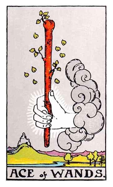 Mountains, grasslands, trees, flowing streams, and a castle in the distance; high above this vast earth, a strong, powerful hand stretches out from the clouds, clutching a wand that symbolizes strength. The wand is thick, adorned with fluttering green leaves dancing in the air. White radiance surrounds the hand, signifying its supreme authority as it conveys divine will. The Ace represents a new beginning; the wand embodies energy, and the Ace of Wands stands for boundless potential—like a tiny spark that hints at a future wildfire waiting to ignite.