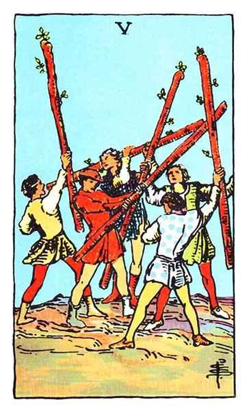 The Five of Wands depicts a mock battle. As the suit of Wands is associated with the element of Fire, the entire scene resembles a chaotic melee. Each person brandishes a wand as a weapon, engaging in combat with one another, their faces etched with confusion. Their similar attire and appearances symbolize a fair fight. Despite the conflict, there is no bloodshed or cruelty—instead, the Five of Wands alludes more to a state of competition, both external and internal, representing inner contradictions and conflicts.